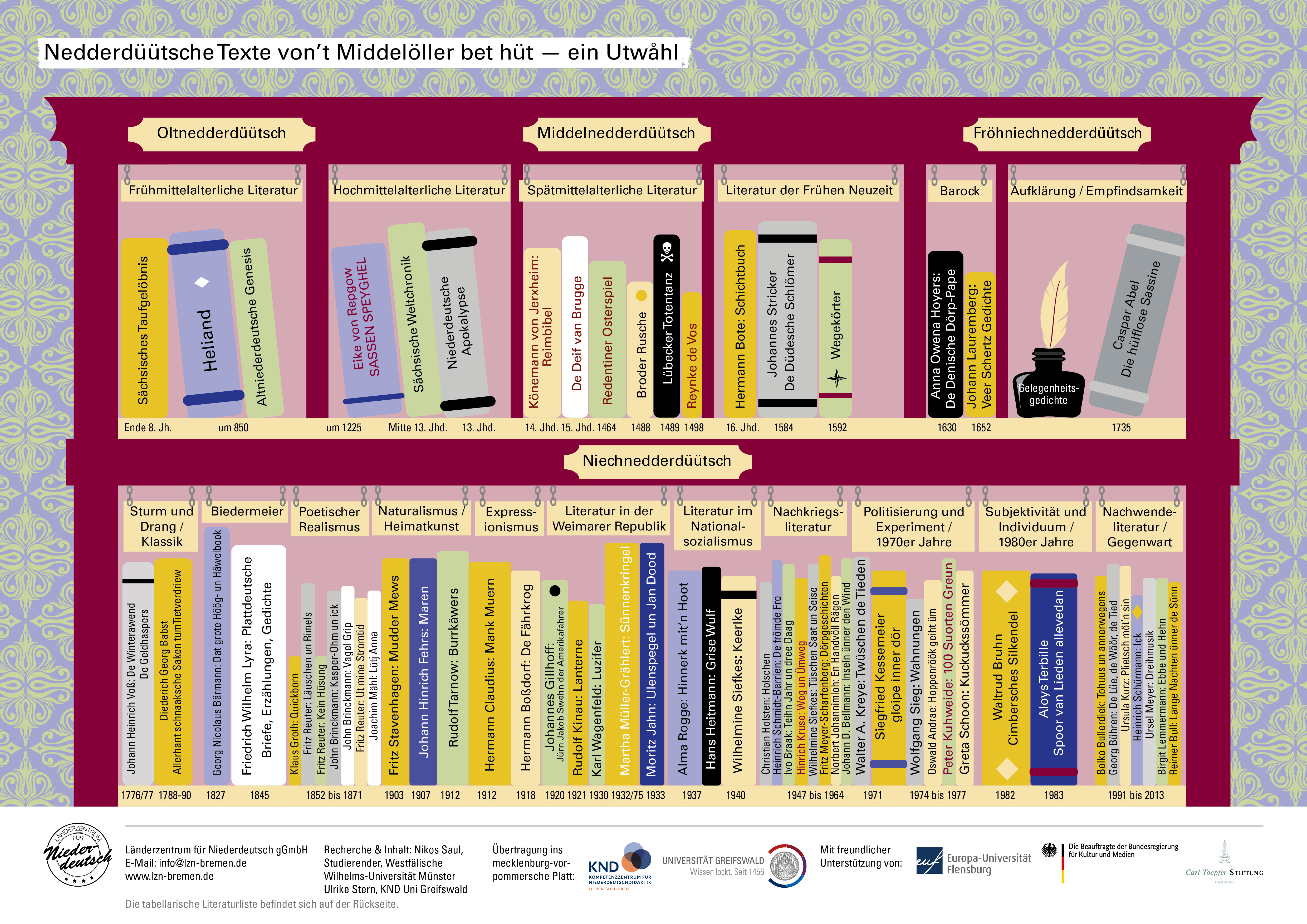 Die niederdeutsche Literaturgeschichte umfasst einen Zeitraum von rd. 1200 Jahren mit Höhen und Tiefen. Jede Menge Material, aber wenn man mal was sucht, dann findet man natürlich nichts. In der Fortbildung wird einerseit ein kleiner Überblick vermittelt, andererseits gezielt nach Beispielen für bestimmte Themenkomplexe und Literaturepochen geschaut – von Jahreszeiten- und Liebesgedichten über Expressionismus bis hin zu Wendeliteratur.