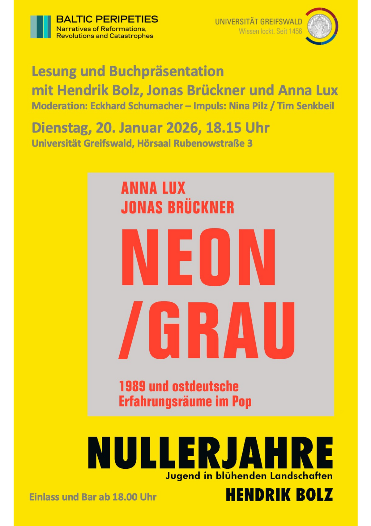 Über Partys und Diskonebel, Seelenfänger und Baseballschlägerjahre: In NEON/GRAU. 1989 und ostdeutsche Erfahrungsräume im Pop (2025) und Nullerjahre. Jugend in blühenden Landschaften (2022) werfen Anna Lux, Jonas Brückner und Hendrik Bolz vielschichtige Perspektiven auf auf ostdeutsche Erfahrungsräume nach 1989. Zwischen Popkultur, Literatur und autobiografischem Erzählen blicken die Bücher auf Jugend und Umbrüche in den 1990er- und 2000er-Jahren. Lesung und Gespräch verbinden biografische Erfahrung und das Schreiben darüber mit kulturwissenschaftlichen Zugängen.
