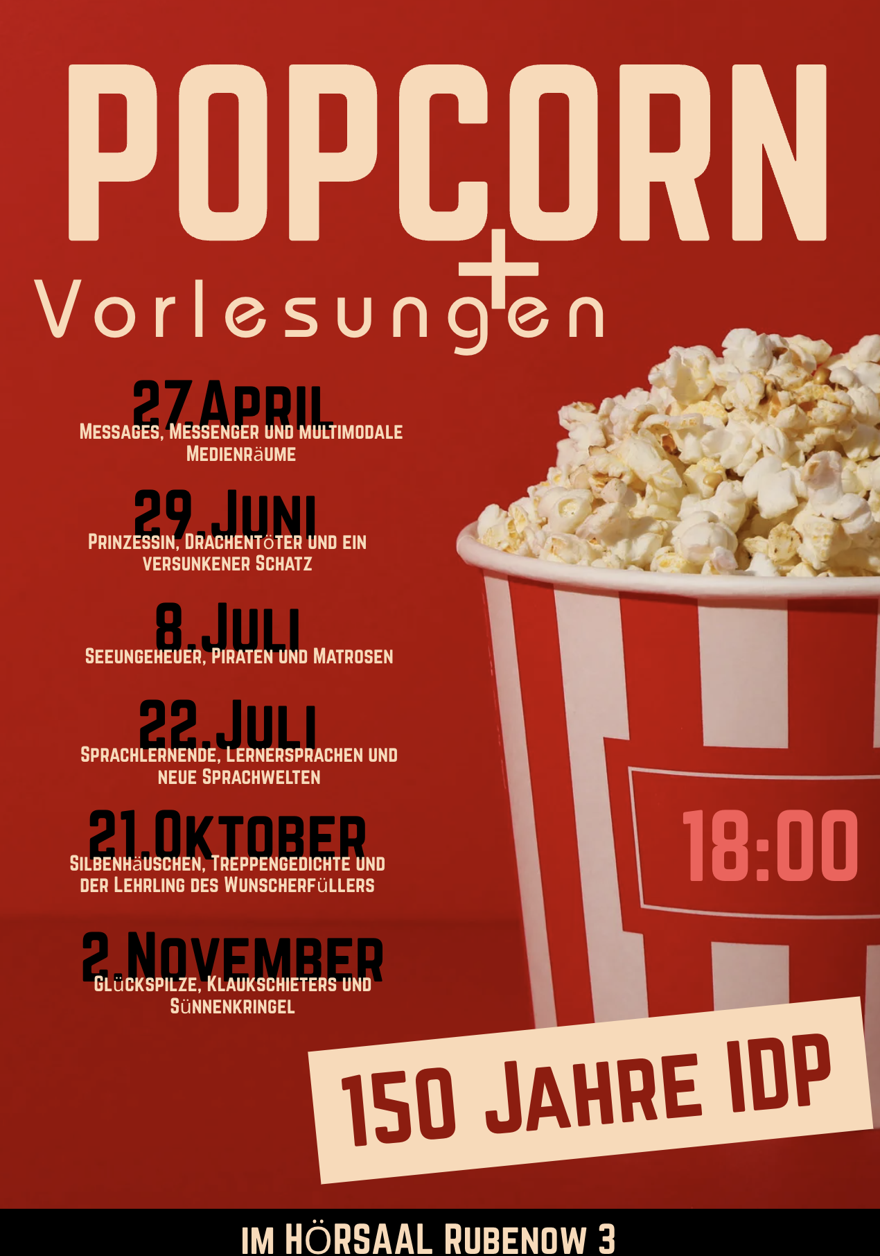 Anlässlich des Jubiläumsjahres des Instituts für Deutsche Philologie werden Popcornvorlesungen veranstaltet. Kommen Sie gerne vorbei und feiern Sie mit uns das Institut. Wir freuen uns auf Sie!