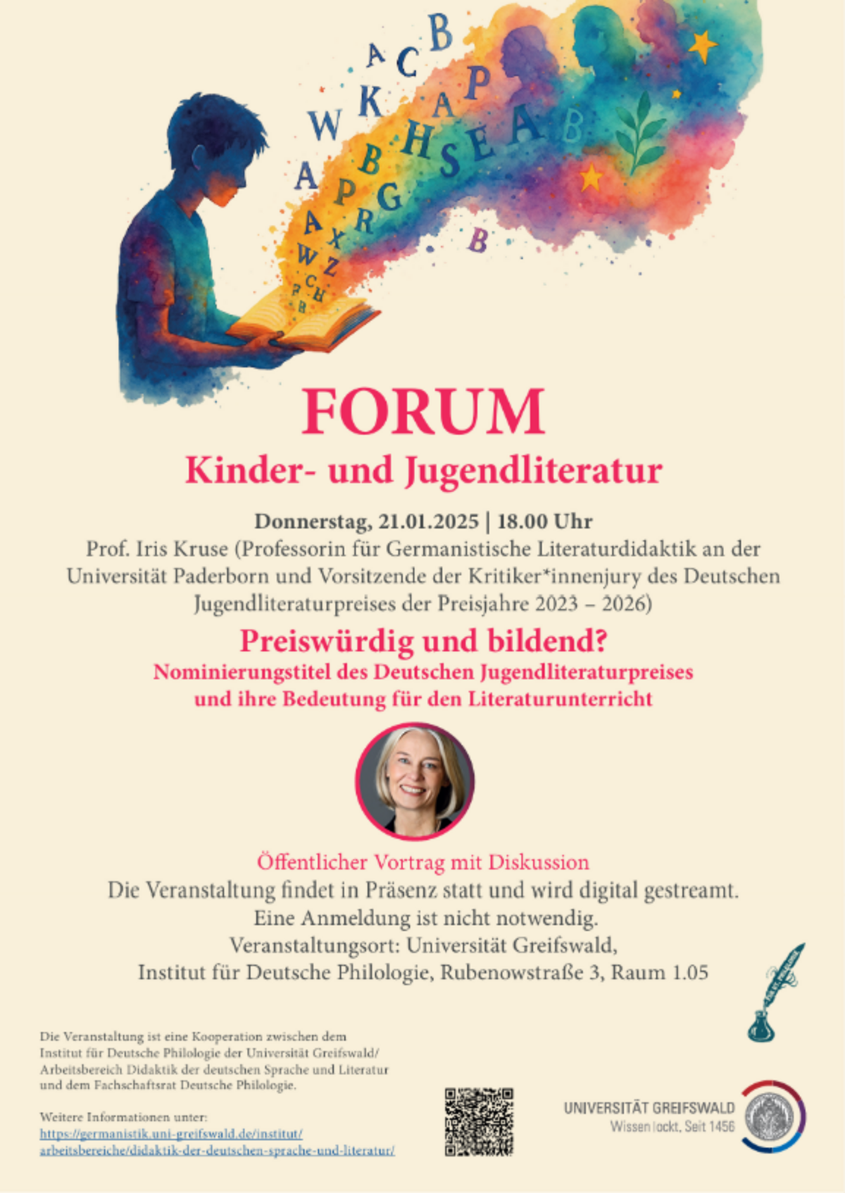 Der Arbeitsbereich „Didaktik der deutschen Sprache und Literatur“ des Instituts für deutsche Philologie an der Universität Greifswald freut sich sehr, Iris Kruse zu einem Online-Vortrag mit anschließender Diskussion in Greifswald begrüßen zu dürfen.