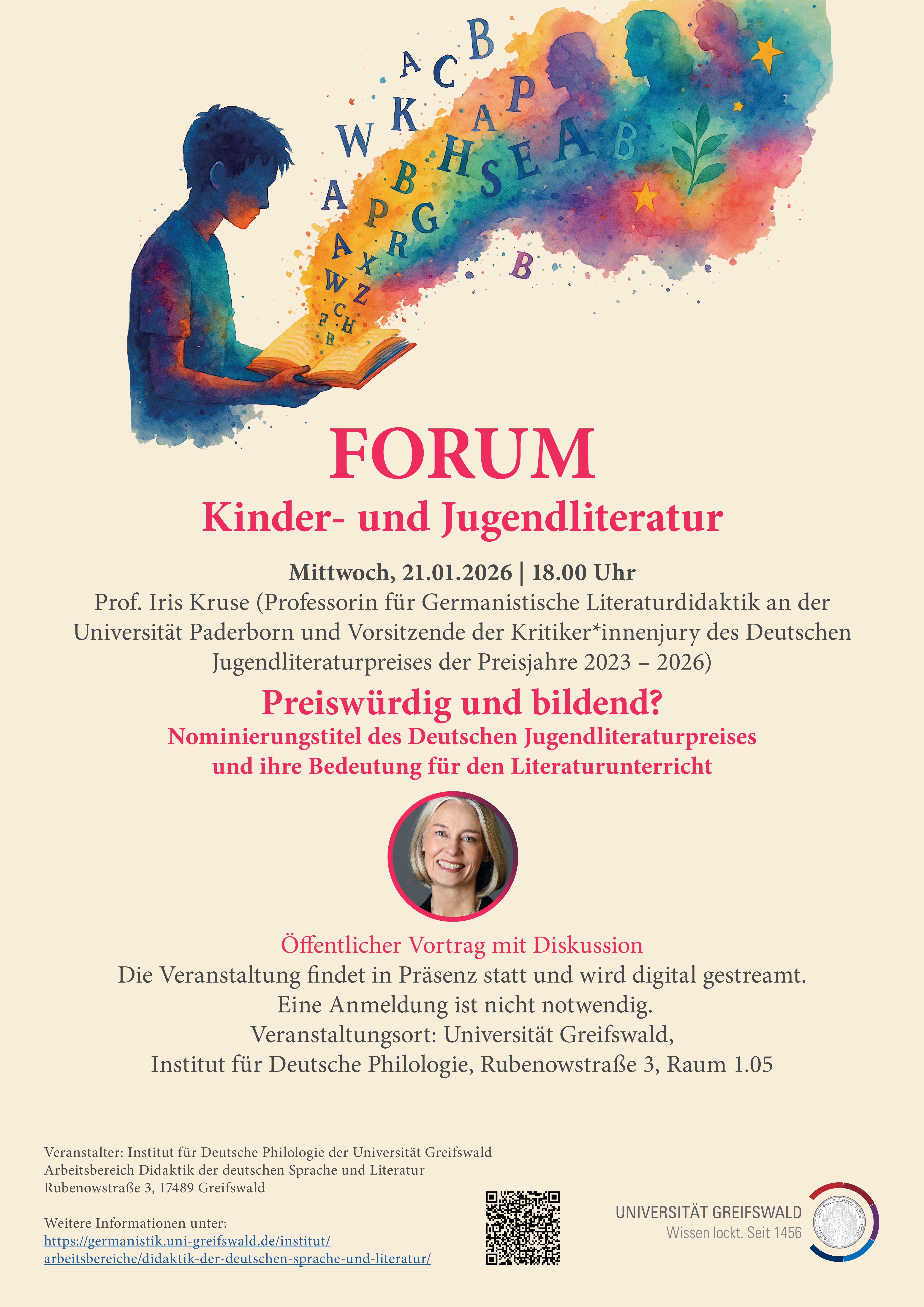 Der Arbeitsbereich „Didaktik der deutschen Sprache und Literatur“ des Instituts für deutsche Philologie an der Universität Greifswald freut sich sehr, Iris Kruse zu einem Online-Vortrag mit anschließender Diskussion in Greifswald begrüßen zu dürfen.