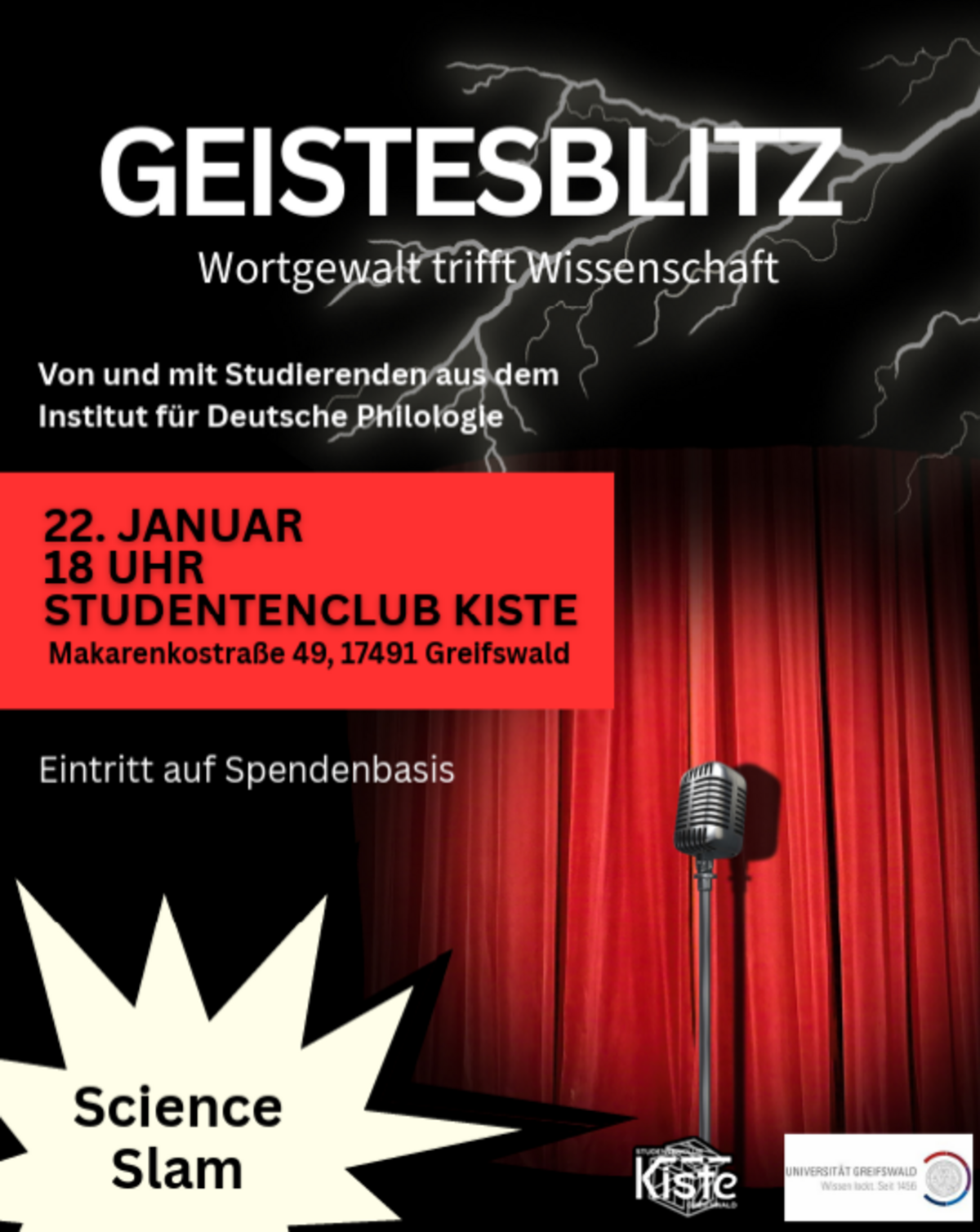 Science Slam "GEISTESBLITZ. Wortgewalt trifft Wissenschaft" 22.01.2026, 18:00 Uhr - 22.01.2026, 20:00 Uhr Von und mit Studierenden aus dem Institut für Deutsche PhilologieEintritt auf SpendenbasisVeranstaltungsort STUDENTENCLUB KISTE / Makarenkostraße 49, 17491 Greifswald Termin speichern Zurück zu allen Veranstaltungen