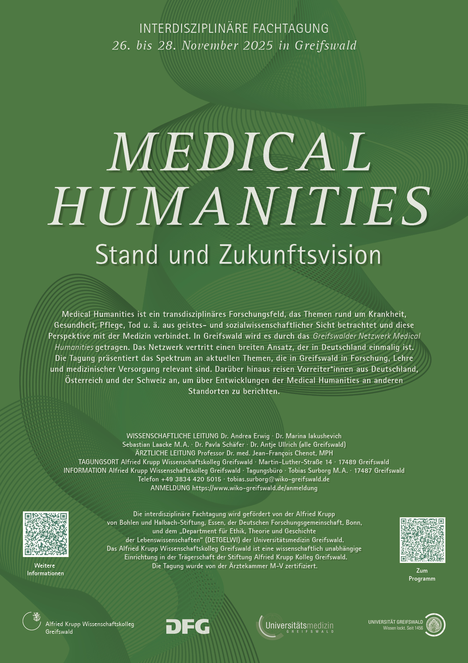 Die Tagung präsentiert das Spektrum an aktuellen Themen, die in Greifswald in Forschung, Lehre und medizinischer Versorgung relevant sind. Darüber hinaus reisen Vorreiter*innen aus Deutschland, Österreich und der Schweiz an, um über Entwicklungen der Medical Humanities an anderen Standorten zu berichten und sich mit den Greifswalder Vertreter*innen der Medical Humanities auszutauschen.